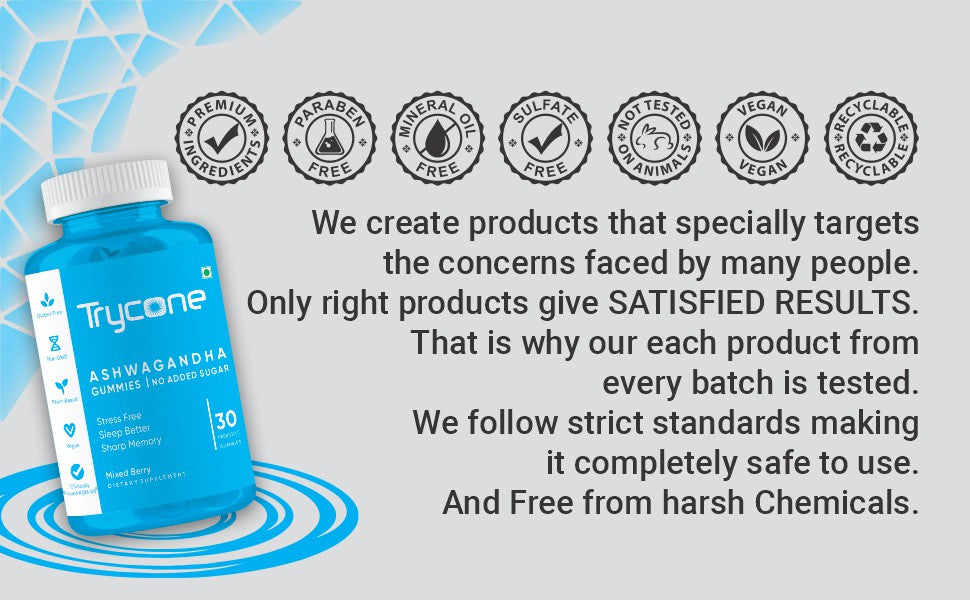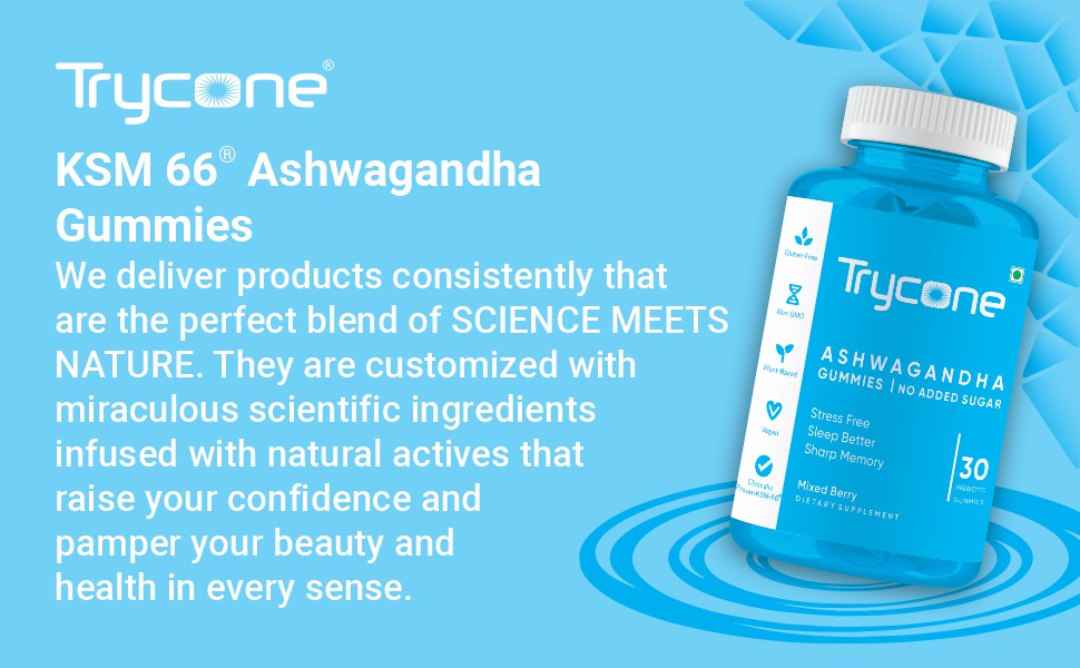 Trycone KSM 66 Ashwagandha Gummies – is formulated with KSM 66 Ashwagandha Root Extract, Vitamin D2 and many other Natural Actives that helps to regulates cortisol, the body’s stress hormone to promote a healthy response to everyday stress, anxiety, depression. It reduces insomnia and improves sleep quality that relaxes your mind. It helps to improve brain function and enhances your memory power. Our Gummies has FOS and No Added Sugar which makes it easy and tasty way for everyone to consume Ashwagandha and enjoy its health benefits. FOS is a Prebiotic which helps good Bacteria to grow and helps with digestion and obesity, people with high cholestrol and diabetic condition can also enjoy these gummies.
